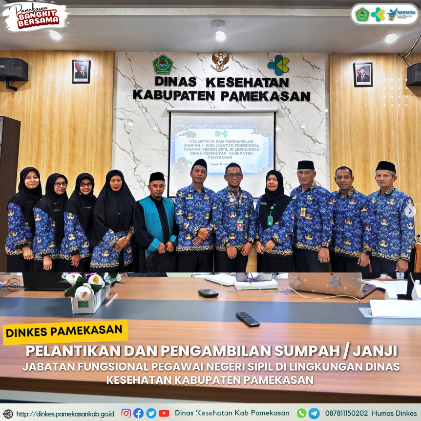 Dinas Kesehatan Kabupaten Pamekasan telah melaksanakan Pelantikan dan pengambilan sumpah / janji jabatan fungsional pegawai negeri sipil Di lingkungan Dinas Kesehatan Kabupaten Pamekasan yang di laksanakan di ruang pertemuan lantai 3 Dinas Kesehatan pamekasan pada tanggal 17 Juli 2025.